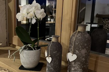Ihre Gastgeberin Silvia hat das Blockhaus sehr liebevoll eingerichtet. Und dies betrifft nicht nur die Nutzbarkeit der Einrichtungsgegenstände, sondern auch das Wohlgefallen für das Auge. Ob Zahnputzbecher, die Kuschelkissen auf der Coach oder die Bereicherung der ansonsten nacken Fensterbänke: Sie sollen sich auch visuell wie im Himmel oder im 5-Stern-Hotel vorkommen. Daneben bekommt auch Ihr e-Bike auch nachts Strom, die Wege vor Ihrem Eingang sind nett beleuchtet, und, und, ... Tauchen Sie ein in einen andere Welt. .