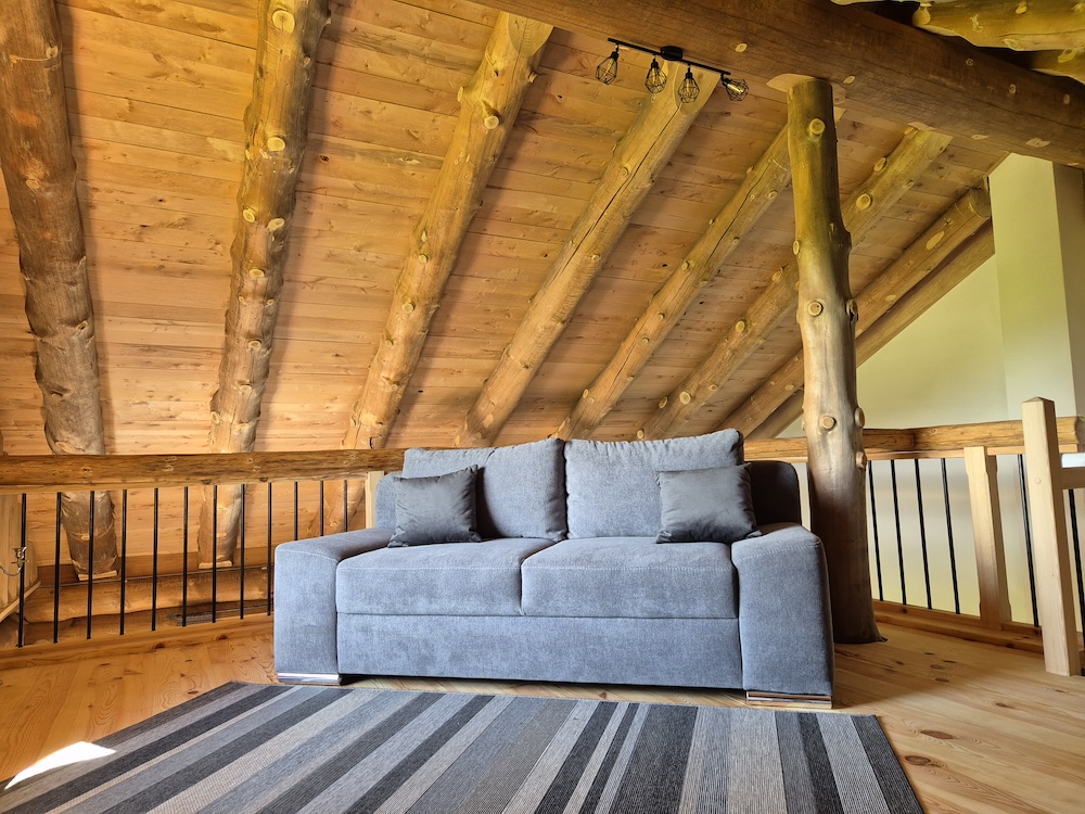 Nachhaltige Bauweise: Die Konstruktion des Blockhauses folgt dem Prinzip eines kanadischen Blockhauses. Der Unterschied liegt darin, dass jeder Bestandteil des Hauses einzigartig ist, jeder Stamm hat seine eigene Maserung, Konsistenz, Dimension und sein eigenes Flair. Wir nutzen dafür nur Baumstämme aus dem eigenen Wald, die wir selbst gefällt haben. Selbst Möbel wie der Esstisch oder der Couchtisch sind aus diesen Materialien gefertigt. Beispielsweise ist das Holz auf dem Holzlagerregal im Blockhaus „Sonnengruß“ aus Balken des abgerissenen Teils des alten Bauerhauses gewonnen worden, also mehr als 100 Jahre alt.