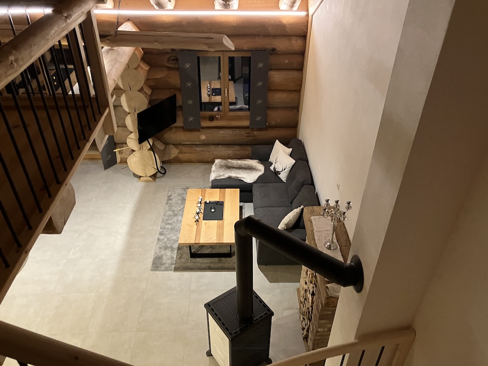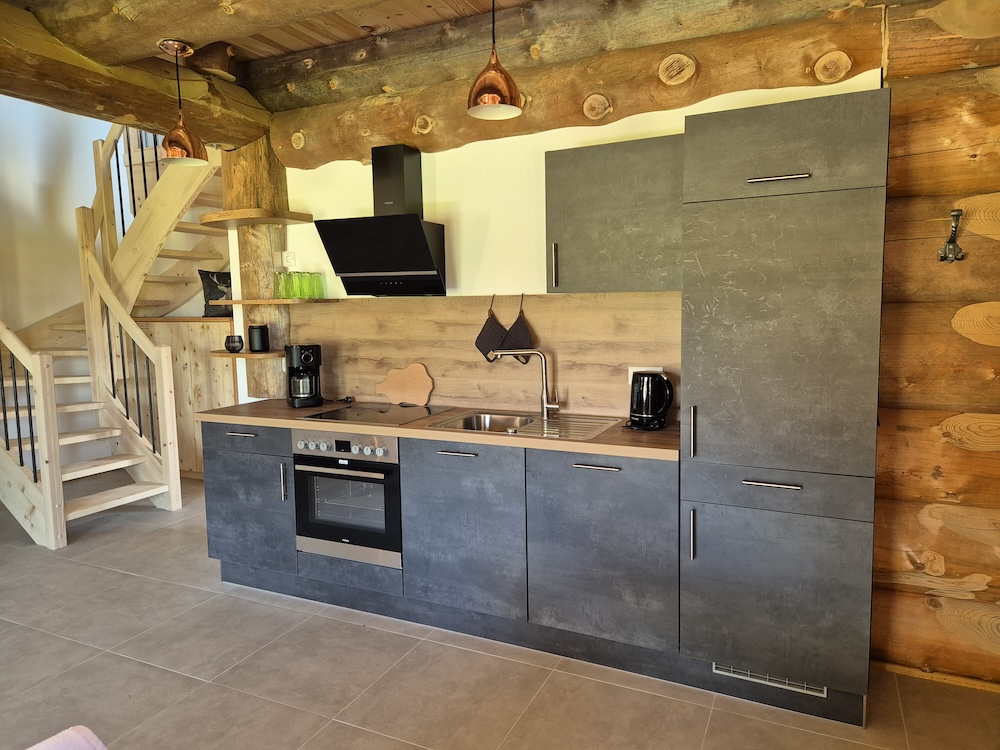 | Der Wohnbereich ist unterteilt in einen Küchenbereich, einen Essplatz sowie einen Coachbereich mit Fernseher und Coachtisch. Ferner steht ein Kaminofen sowie Brennholz zur freien Verfügung. |