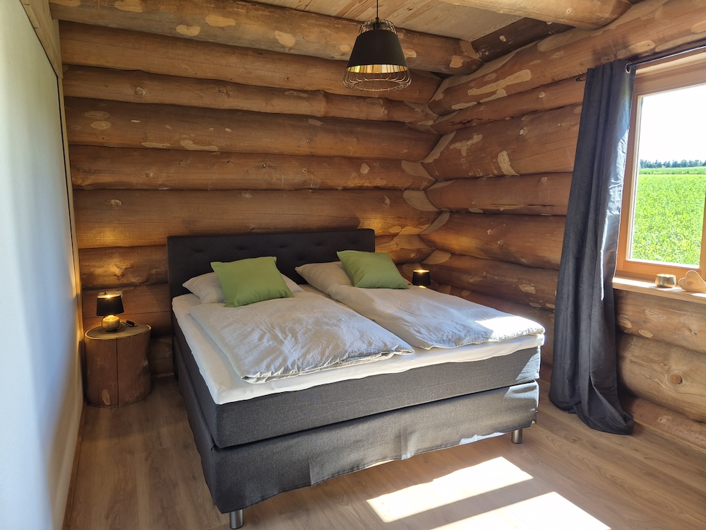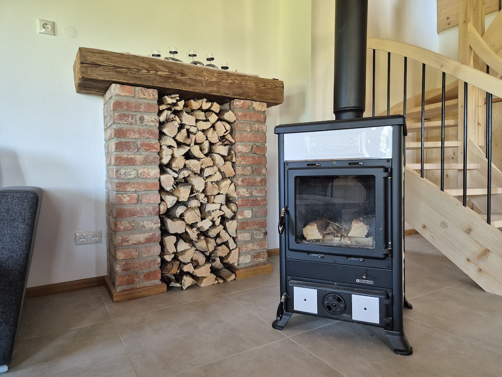 Nachhaltige Bauweise: Die Konstruktion des Blockhauses folgt dem Prinzip eines kanadischen Blockhauses. Der Unterschied liegt darin, dass jeder Bestandteil des Hauses einzigartig ist, jeder Stamm hat seine eigene Maserung, Konsistenz, Dimension und sein eigenes Flair. Wir nutzen dafür nur Baumstämme aus dem eigenen Wald, die wir selbst gefällt haben. Selbst Möbel wie der Esstisch oder der Couchtisch sind aus diesen Materialien gefertigt. Beispielsweise ist das Holz auf dem Holzlagerregal im Blockhaus „Sonnengruß“ aus Balken des abgerissenen Teils des alten Bauerhauses gewonnen worden, also mehr als 100 Jahre alt.